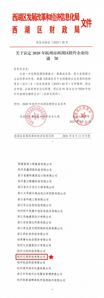 近日,杭州西湖区发展改革和经济信息化局、西湖区财政局公布了2020年度杭州市西湖区“瞪羚企业”认定名单,杭州凡闻科技有限公司凭借出众的自主研发能力、良好的企业成长性、坚持“专注资讯、专注数据、专注服务”成功入选。