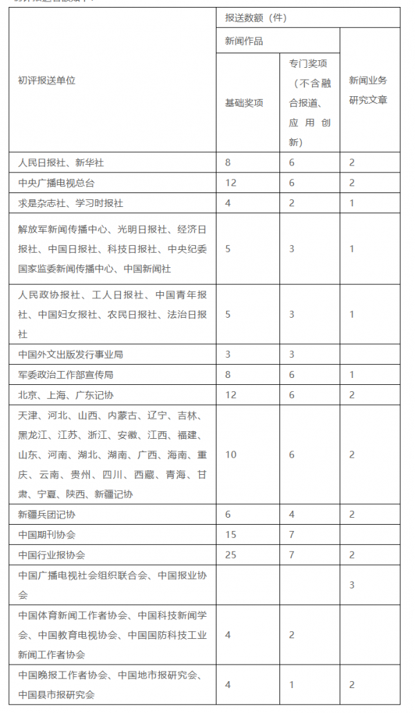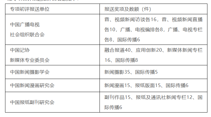 中国记协委托专业协会承担部分作品的专项初评,报送专项初评的作品名额由相关专业协会另行通知。
