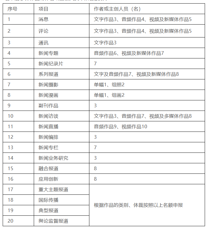 评选项目共20个,新闻单位的原创作品均可参评。基础类项目按作品体裁申报,专门类项目不限作品体裁。