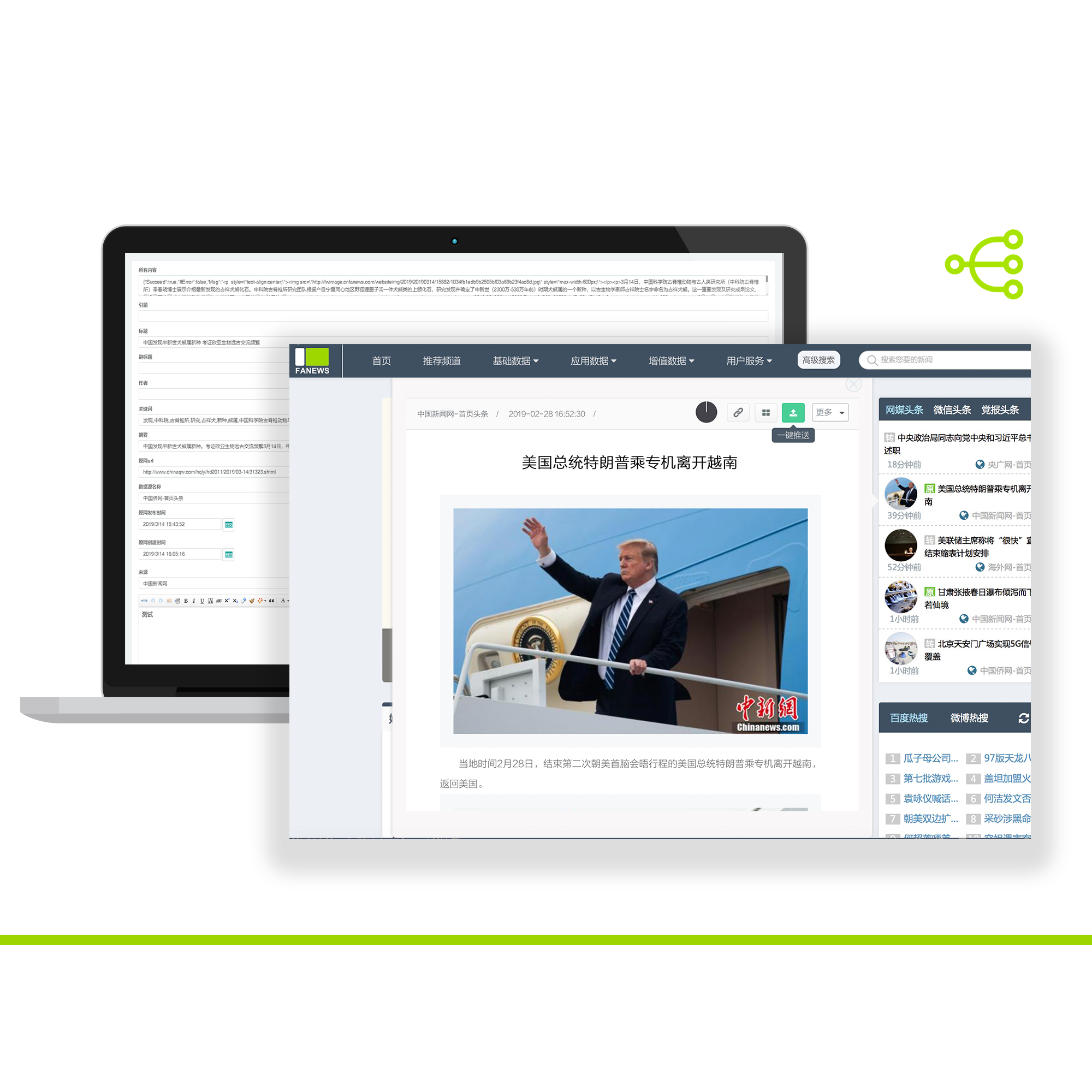 新闻采编制作:用户可以实时将凡闻平台中浏览到的纯净化、格式统一的新闻进行推送,帮助采编人员提高采编效率。