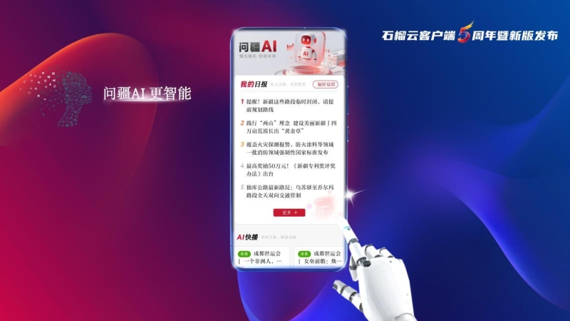 仪式上,石榴云客户端7.0版正式上线。新版客户端着重于AI智能化应用和服务能力升级,“四大亮点”令人耳目一新。一是“未来版”更新潮,采用“单列瀑布流+个性化推荐算法”设计,带给用户“开盲盒”的期待感;二是“问疆AI”更智能,“我的日报”“AI问政”“AI快播”等智能应用带来交互式体验;三是“石榴圈”更好玩,构建“新闻+社交”双向传播生态;四是7位炫酷“数字主播”,给用户有温度的陪伴。