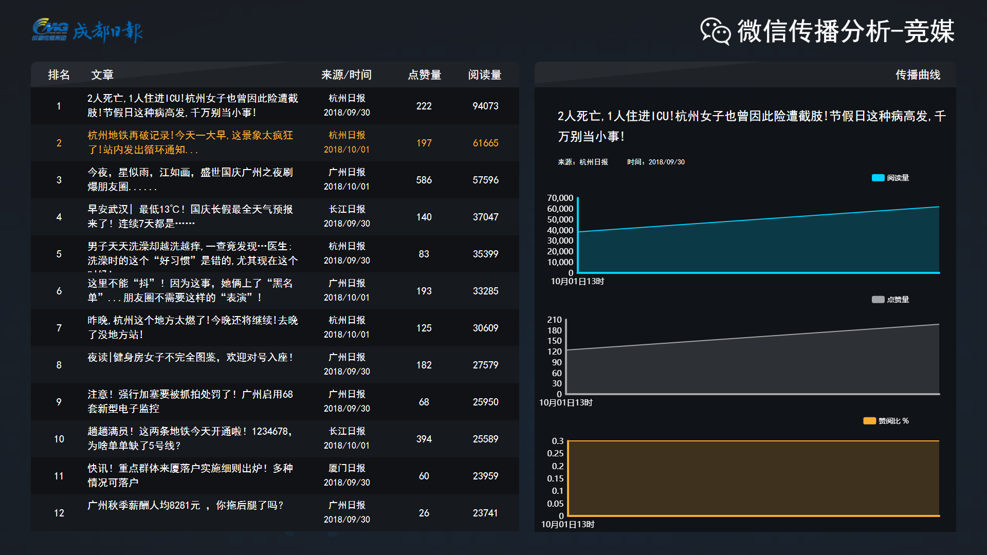 根据用户需求,提供用户指定微信公众号发布内容的相关数据数据,如阅读量、好看量、好看/阅读比,分析相关文章的传播力,并将相关数据进行全天候轮播显示,方便用户浏览、对比,帮助用户及时掌握竞争对手的相关情况。